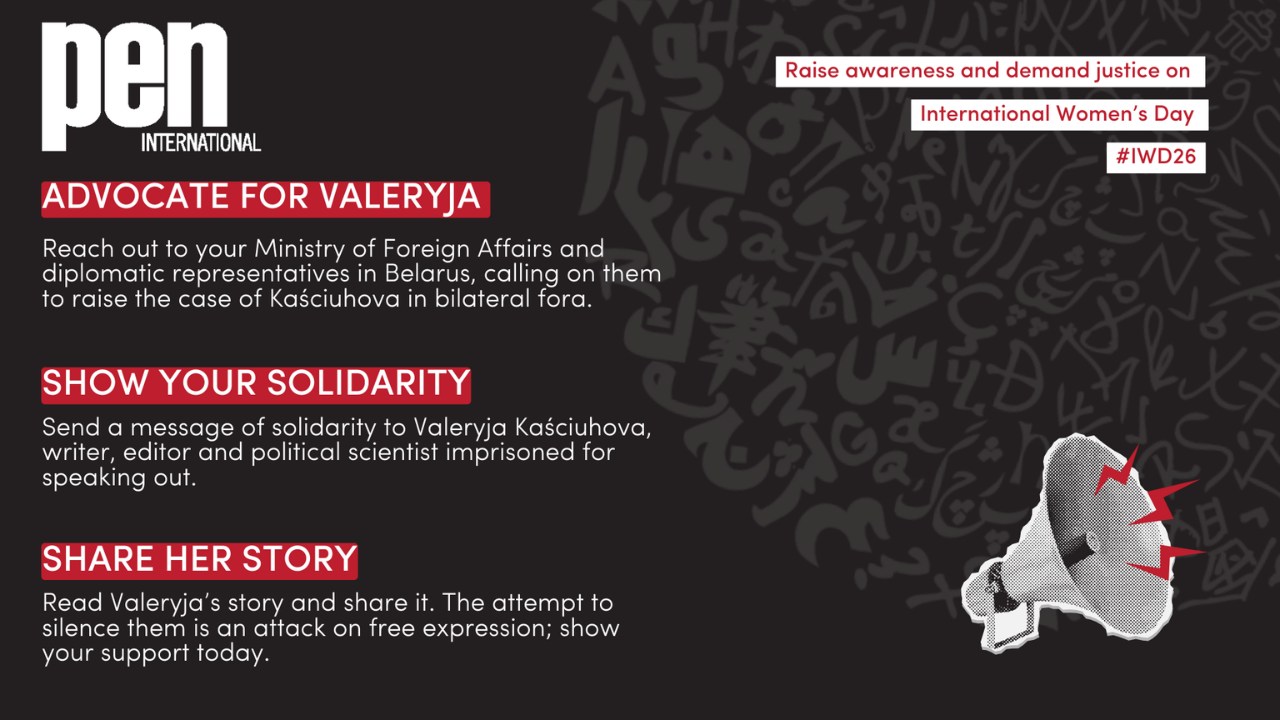 Распаўсюджвайце інфармацыю пра Валерыю Касцюгову ў сацыяльных сетках. Выкарыстоўвайце хэштэгі #ValeryjaKaściuhova, #IWD26 і #InternationalWomensDay, пазначаючы @peninternational (Instagram), facebook.com/peninternational (Facebook) і @peninternational.bsky.social (Bluesky).